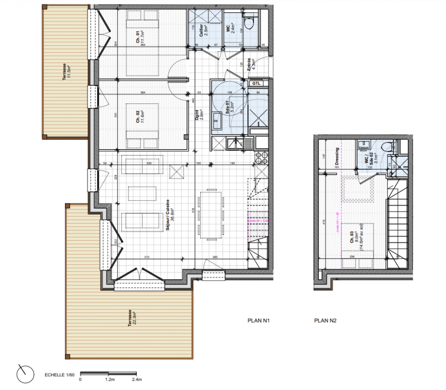 La résidence Les Chalets Bajja se compose de 25 logements répartis en trois entités :Un bâtiment collectif (A) de 23 appartements du 2 au 4 piècesDeux chalets individuels (B et C)L’architecture s’inspire des codes traditionnels des chalets d’alpage : bardage bois, toitures gris ardoise, soubassements sur pilotis.Les intérieurs offrent des volumes généreux (hauteur sous plafond min. 2,50 m) et sont prolongés par de vastes balcons ou terrasses pour profiter pleinement du panorama alpin.La construction respecte la RT 2012, la réglementation acoustique et PMR.Emplacement premium : à 700 m du téléski du Reguet, au pied des pistes et proche des commercesRésidence intimiste : seulement 25 logementsBalcons et terrasses spacieux avec platelage boisArchitecture authentique et contemporaineStationnement en sous-sol, caves privatives, casiers à ski, local vélosParties privatives :Revêtements sols : carrelage grand format (Novoceram ou Porcelanosa) dans pièces de vie, parquet contrecollé bois dans chambresMurs et plafonds : peinture satinée claire, un mur séjour habillé boisSalle de bains : meuble vasque avec miroir et LED, faïence toute hauteur, baignoire ou douche avec pare-douche, sèche-serviette électriqueMenuiseries extérieures : bois avec double vitrage, volets roulants motorisés ou battants boisTerrasses et balcons : platelage bois vissé sur lambourdesPortes palières : blindées anti-effraction, serrure 3 points A2PParties communes :Hall décoratif avec carrelage 60x60, faux plafond acoustiqueContrôle d’accès Vigik vidéophone (Bâtiment A)Ascenseur 630 kg dans Bâtiment ATechniques :Chauffage par pompe à chaleur (PAC) : collectif pour Bâtiment A, individuel pour B et CProduction ECS : système mixte PAC chaudière gaz ou ballons individuelsVMC hygroréglableÀ proximité immédiate :Téléski du Reguet : 700 mCommerces, restaurants, marché local : 500 mDomaine skiable : Espace Diamant (192 km de pistes)Accès :En voiture : D1212 (3 km), A43 (45 km)En train : Annecy à 54 km