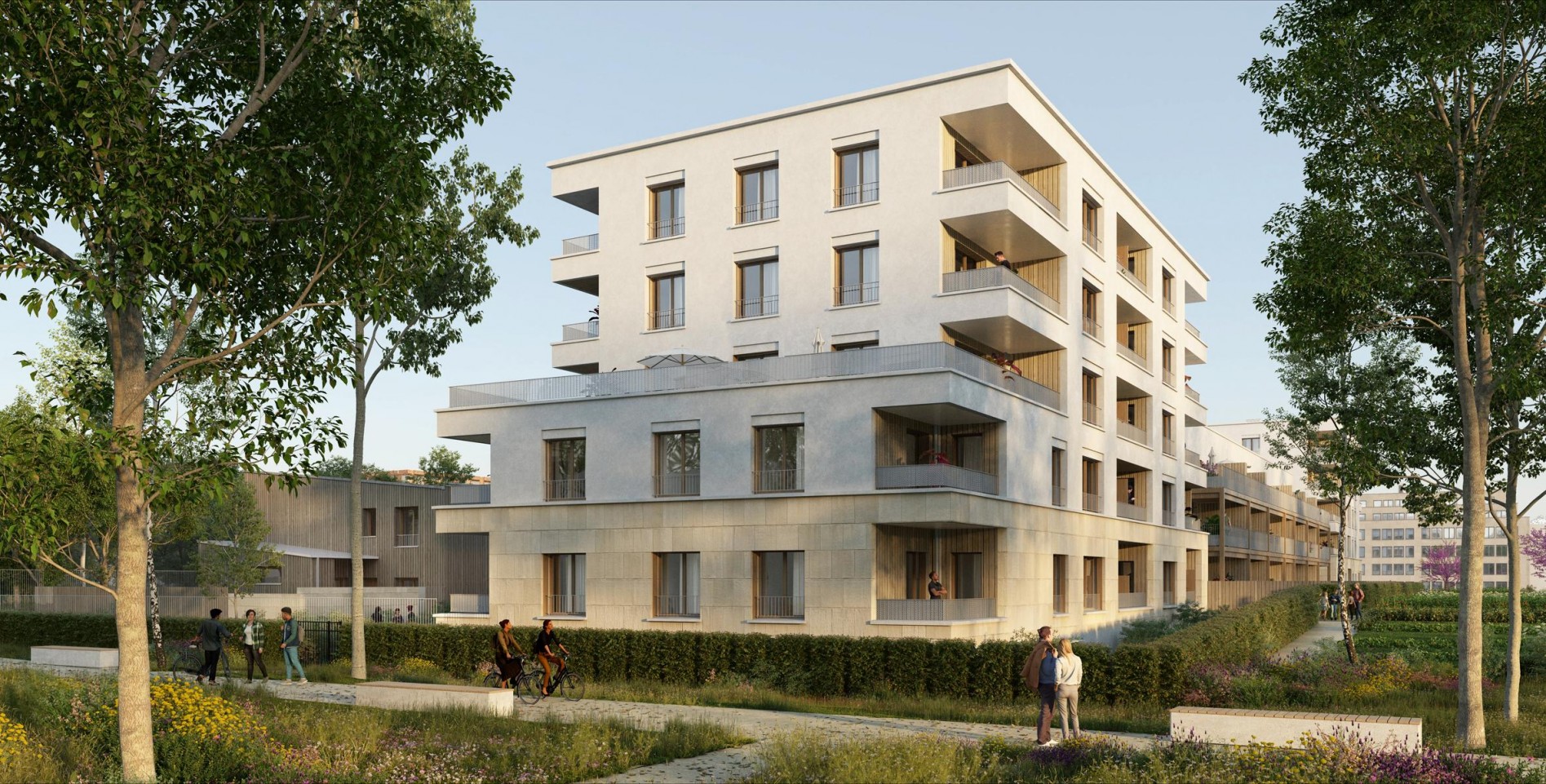 Accessible depuis l’avenue de l’Europe et la nouvelle voie, la sente piétonne. La venelle piétonne située au coeur de l’îlot permet également de rejoindre les deux halls d’entrée des bâtiments collectifs ainsi que les accès directs vers les logements intermédiaires et les maisons.