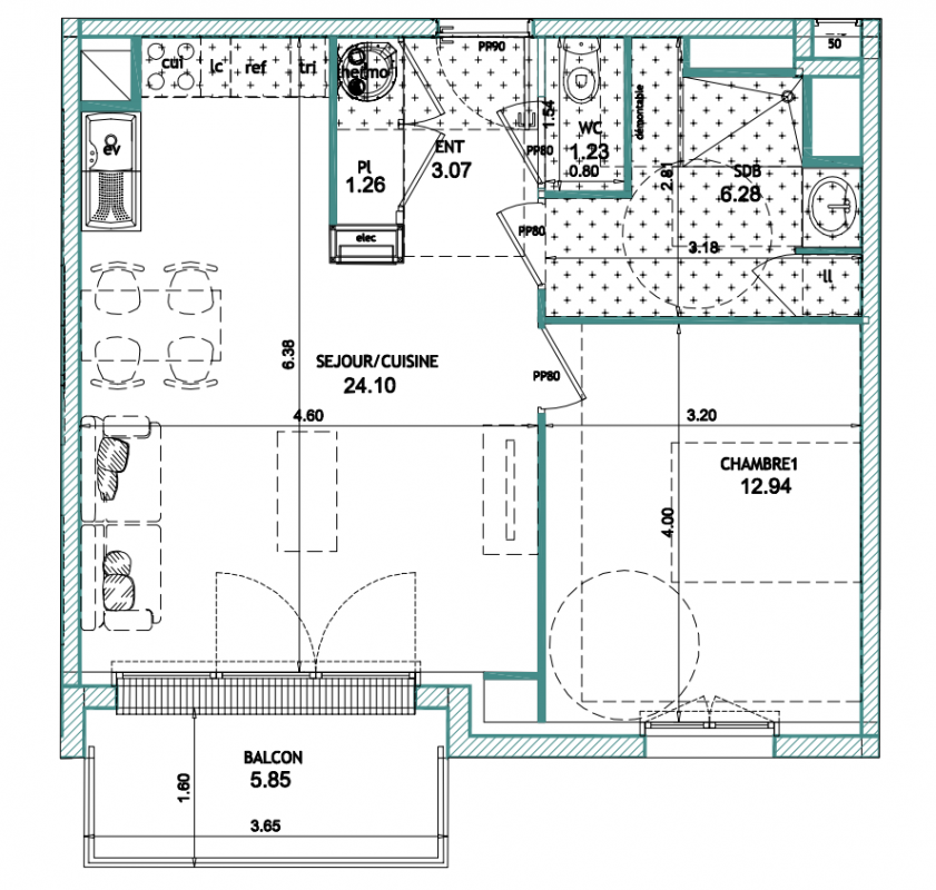 374 000€ Appt. T2 46.56m2 1er