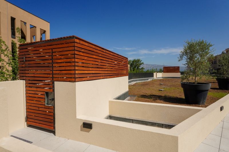L'ensemble s'affine côté Nord pour laisser place à une jardinière plantée telle une colline artificielle de pins parasols et de lauriers.